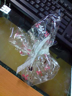 missing cookies found in my enormous tummy! wahaha~ i forgot to snap a picture of the cookies man. was too excited. so i try to wrap it back. then it became like a 'bunny' head. right?